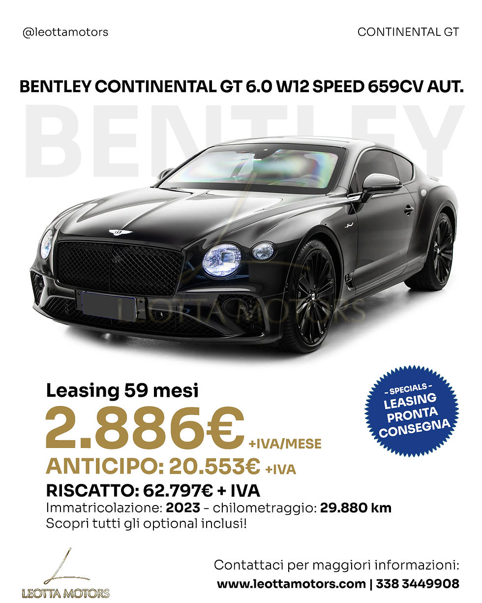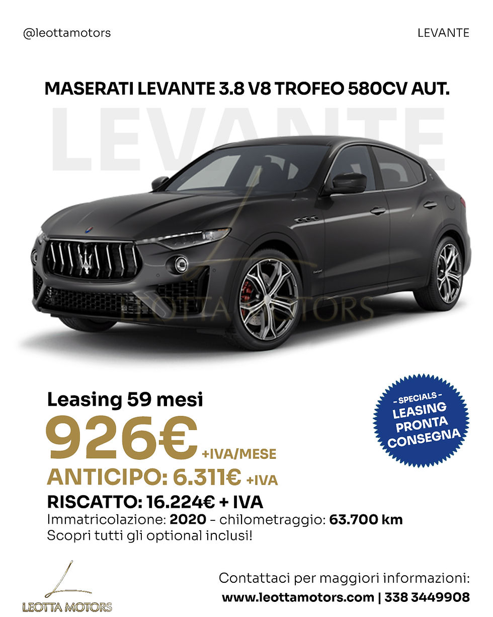 Il leasing auto è la soluzione ideale per aziende, professionisti e privati che desiderano un veicolo moderno, benefici fiscali e massima flessibilità. Con Leotta Motors puoi personalizzare anticipo, durata, rate e valore di riscatto, scegliendo se includere servizi assicurativi come furto e incendio, Kasko e assistenza stradale H24, oppure optare per un leasing puro. Trattiamo qualsiasi veicolo disponibile sul mercato europeo – nuovo, usato, km0, elettrico, ibrido, sportivo, SUV, supercar, furgoni e veicoli commerciali – anche se non presente tra le promo pubblicate: basta richiederlo. I nostri veicoli provengono esclusivamente da una rete europea certificata, composta da concessionari ufficiali e partner approvati, garantendo qualità e trasparenza. Un consulente dedicato ti seguirà in ogni fase, dalla scelta del veicolo alla consegna.